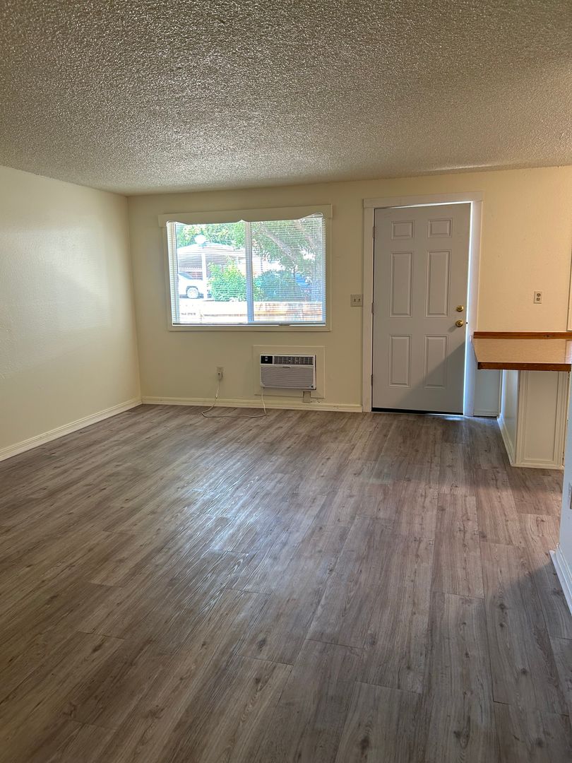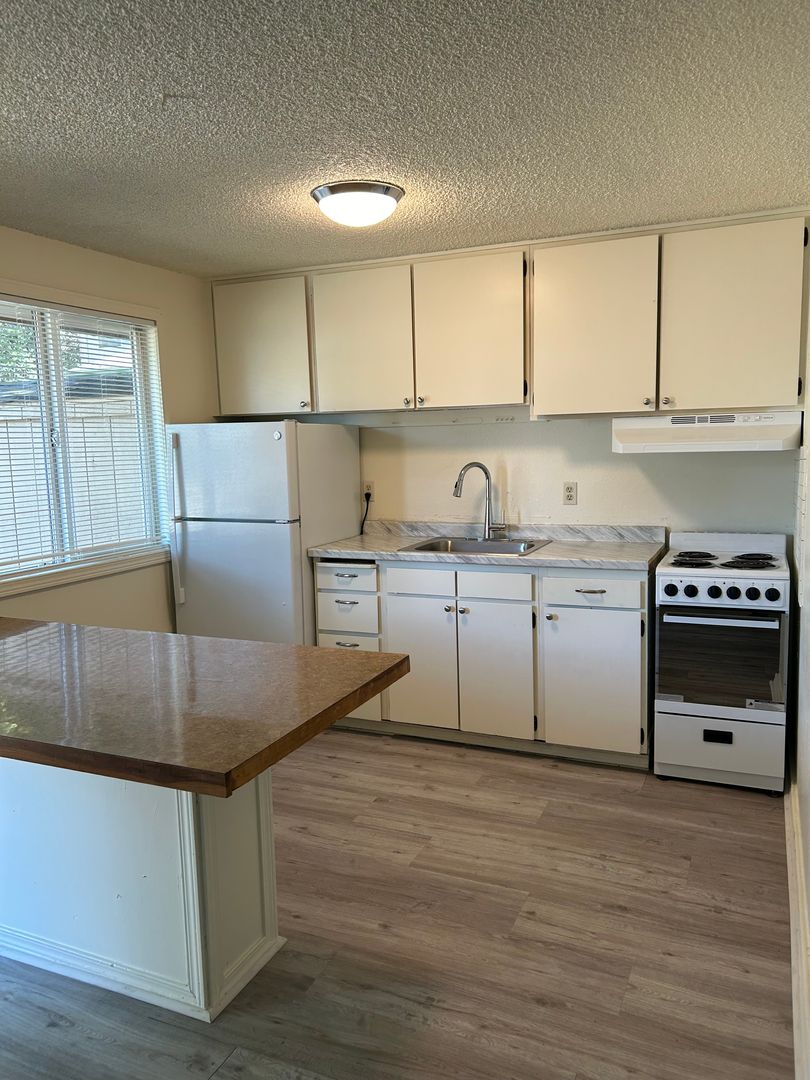 Open living room to kitchen featuring range, refrigerator and breakfast bar. Laminate wood flooring throughout with vinyl in the bathroom. AC! Fenced yard with an extra private storage shed.