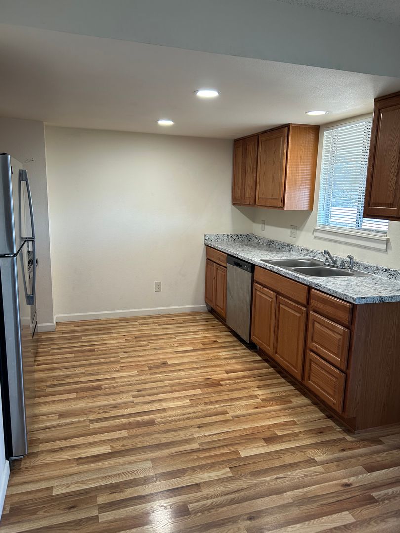 2-bedroom / 1-bathroom apartment features laminate-wood flooring throughout. This cute floor plan features built ins, a spacious kitchen and dining nook. All major appliances included + a dishwasher! Washer/dryer hook ups, back deck and central air!